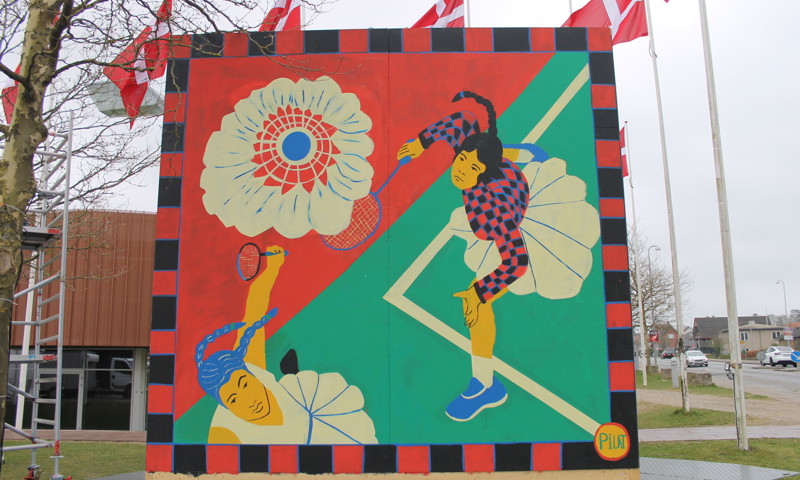 Tre gigantværker på hver næsten 5 x 5 meter blev til som et live-painting-event i samarbejde med Galleri Grisk. Kunstneren, der var udvalgt til at sætte sit kunstneriske aftryk på EM i badminton hedder Pil Anna Tesdorpf, men går under kunstnernavnet 'PILAT'.