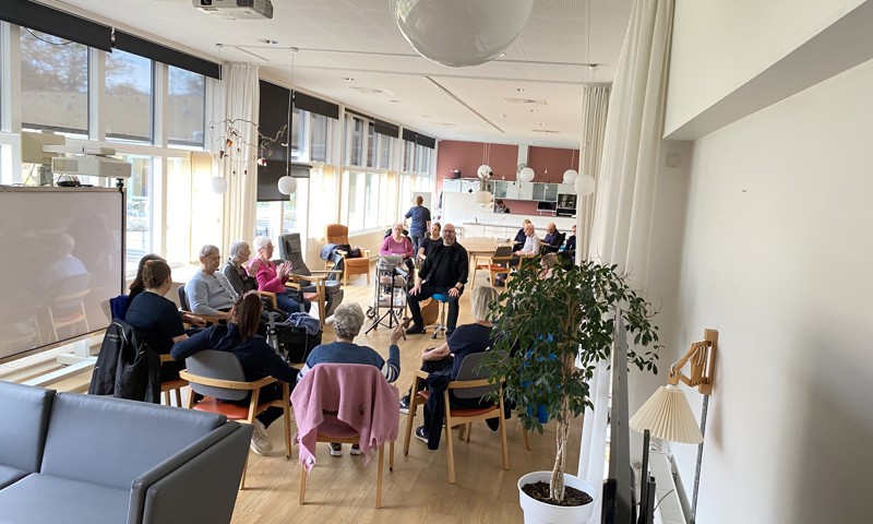 Om onsdagen er stemningen høj på demensplejehjemmet Slotsgården i Horsens. Her samles beboere fra flere demensplejehjem, Ceres stuen, Drivhuset og Malteriet til 'Stem i'.