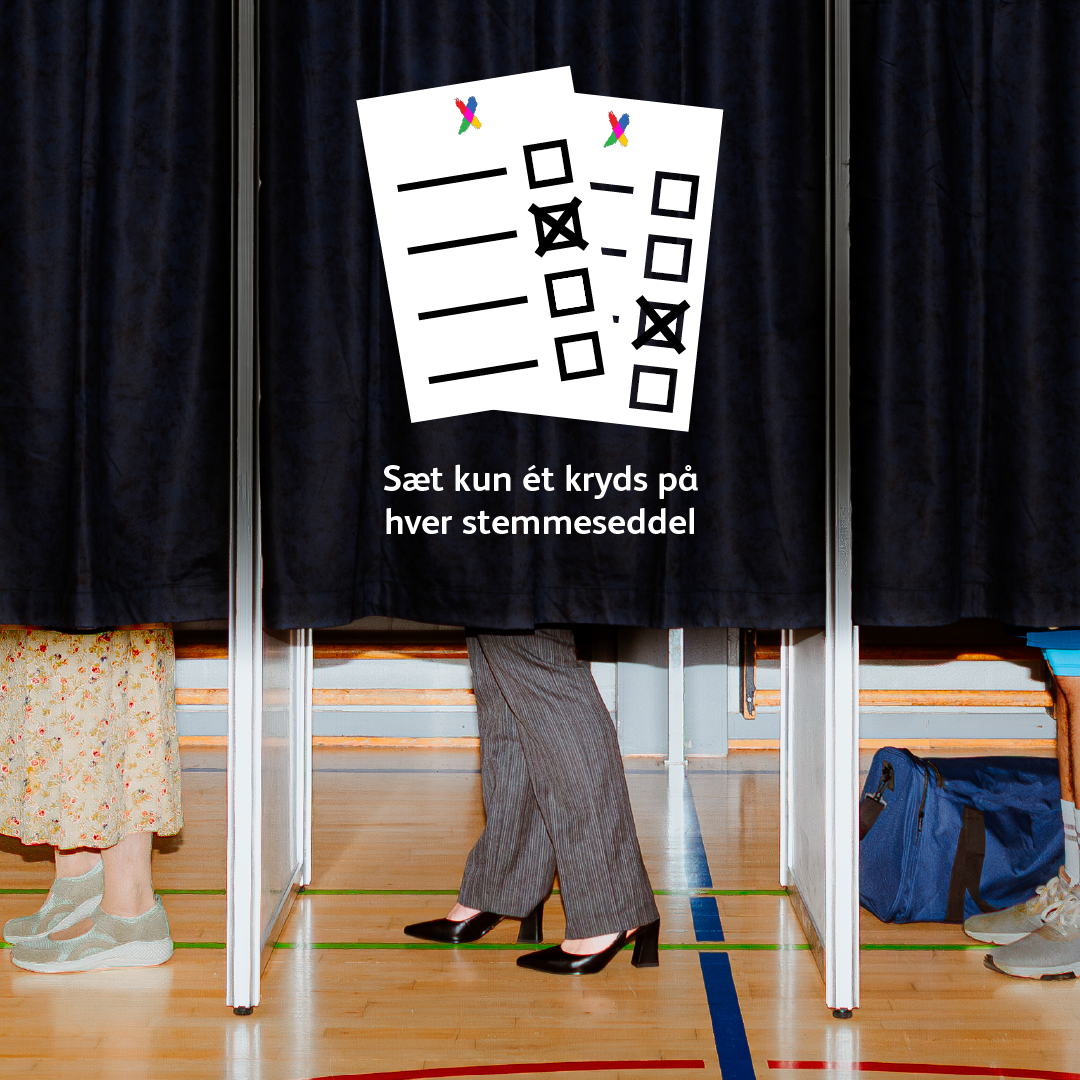 Når du møder op på dit valgsted, får du to stemmesedler af os. Dem tager du med dig ind i stemmeboksen, hvor du kan sætte dit kryds.